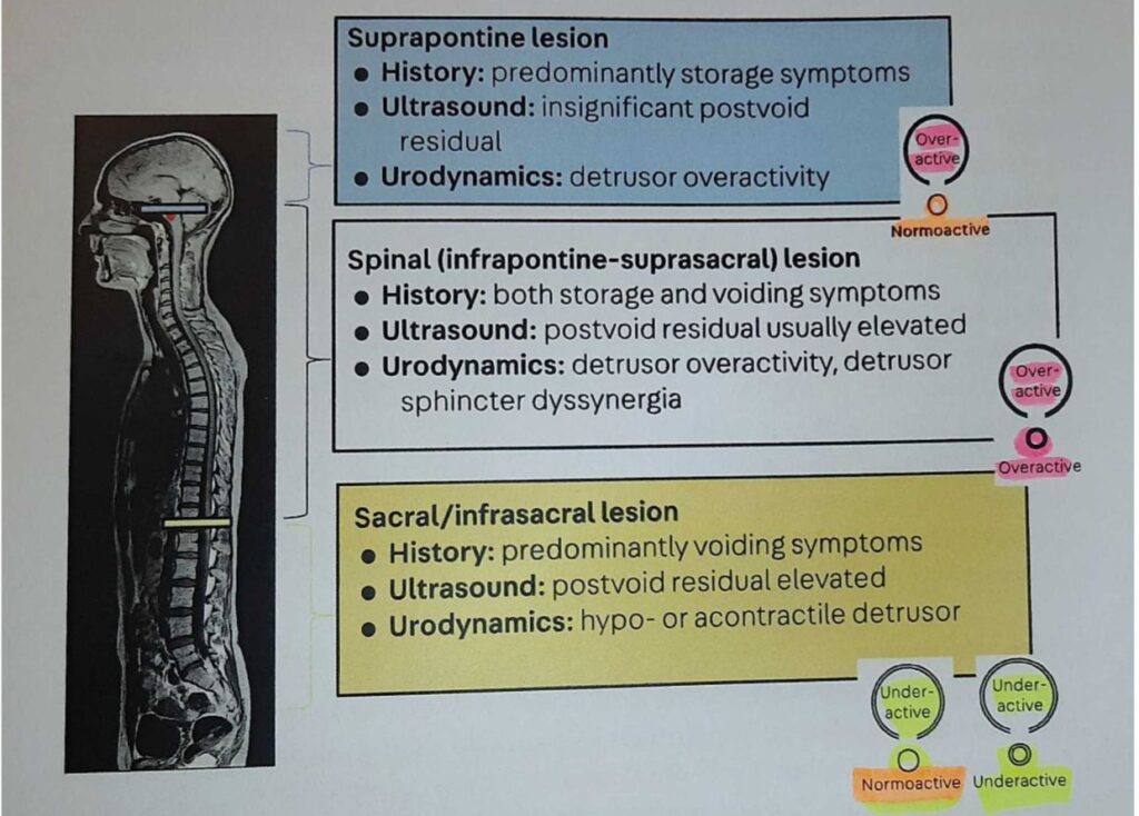 با توجه به محل ضایعه که نخاع است علایم غالب بیش فعالی عضله دتروسور و عدم هماهنگی دتروسور اسفنکتر است.